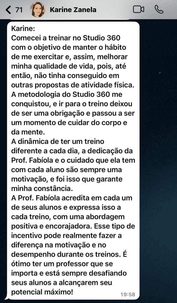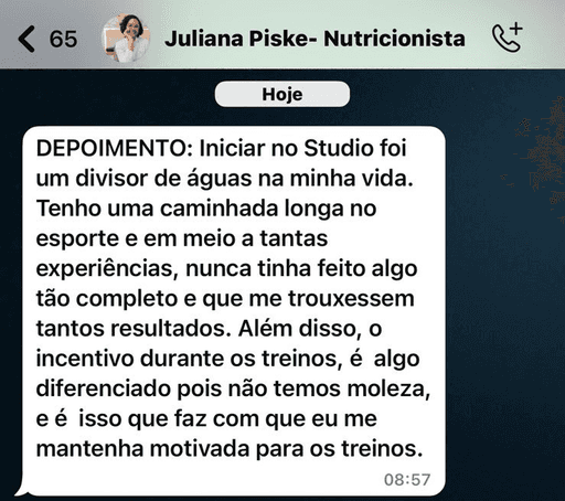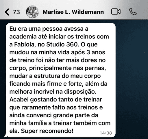 Hoje sou idealizadora do Studio 360º Atividades Físicas, um espaço onde, há mais de 11 anos, aplico treinos funcionais para todos os tipos de pessoas. De iniciantes a quem achava que nunca ia conseguir se movimentar. Aqui no Studio, já passaram mais de 1000 alunos.
